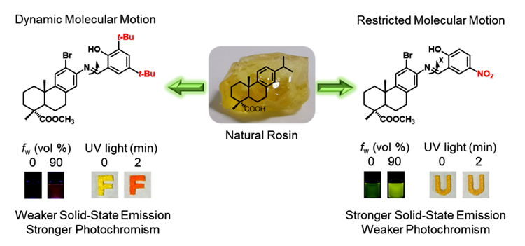 随着合成化学的发展,具有明亮发光性能的人造发光材料得到充分探索,但不少材料都存在聚集状态下发射减弱或淬灭、可再生性和可持续性差等问题。由此出发,科研人员合成出一类具有聚集诱导发光(AIE)特性的天然松香基聚集诱导发光分子(BioAIEgens)。实验表明,它们具有良好的生物相容性、靶向细胞器成像能力和聚集态光致变色性能。经过机理研究证实,源自天然松香分子的脂环基团的引入有助于抑制激发态分子运动,从而增强聚集态发射。该研究从根本上阐明了天然松香中脂环结构在发光分子设计中的重要作用,并从实践上提供了一种可大规模获得生物相容性松香基聚集诱导发光分子的天然资源,提升了天然松香的附加值。