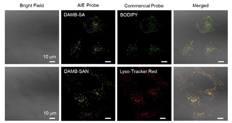 松香基BioAIEgen的靶向细胞器成像(DAMB-SA靶向脂滴;DAMB-SAN靶向溶酶体)
