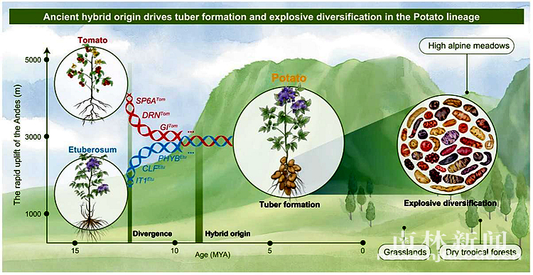 该研究通过进化基因组学与分子功能实验的整合研究手段,揭示了重要粮食作物马铃薯的古老同倍性杂交物种形成历史。研究发现,马铃薯组(Petota)祖先类群起源于约9百万年前的一次古老杂交事件,其亲本类群分别为类马铃薯组(Etuberosum)祖先类群与番茄组(Tomato)祖先类群。来自不同亲本的等位基因在马铃薯祖先类群中重新组合,形成了全新的基因调控网络,并促使新器官——薯块的形成。古老杂交物种形成事件导致亲本基因组在马铃薯祖先类群中发生了广泛的重新组合,“马赛克式”的基因组特征与薯块共同作用,驱动了马铃薯类群的适应性辐射演化,为现存马铃薯类群的物种多样化做出了巨大贡献,马铃薯也因此展现出强大的杂种优势与生态适应性(论文链接:https://doi.org/10.1016/j.cell.2025.06.034)。