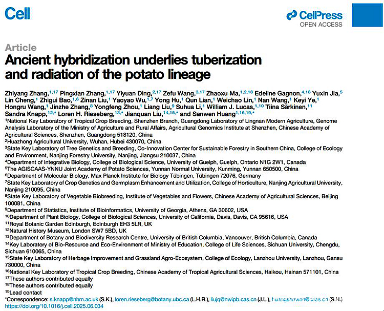 【南林新闻中心讯】7月31日,我校生态与环境学院王则夫教授以共同第一作者在国际权威期刊《Cell》(中文《细胞》)上发表了题为“Ancient hybridization underlies tuberization and radiation of the potato lineage”的研究论文,我校为第三完成单位。