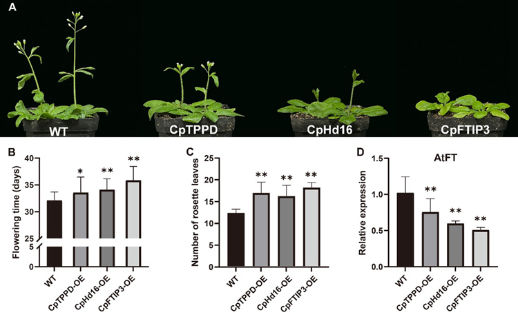 图1 CpTPPD、CpHd16和CpFTIP3的异源过表达延迟了拟南芥的花期