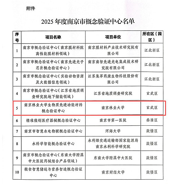 【南林新闻中心讯】近日,南京市科学技术局发布《关于公布2025年度南京市概念验证中心名单的通知》,由我校牵头,联合我乐家居股份有限公司、南京汇科高分子材料有限公司共同申报的生物质先进功能材料概念验证中心(下简称中心)成功获批。