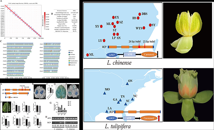 鹅掌楸属(Liriodendron)现存鹅掌楸(L. chinense)和北美鹅掌楸(L. tulipifera)两个物种,二者花瓣颜色差异显著,前者呈黄绿色,后者中部具橙色条纹,这种分化与类胡萝卜素积累密切相关,但其遗传调控机制尚不明确。研究团队完成北美鹅掌楸“MSL”染色体水平高质量基因组组装(1.57 Gb),结合转录组、代谢组及群体重测序数据,解析类胡萝卜素合成通路关键基因。发现北美鹅掌楸花瓣橙色条纹区的类胡萝卜素合成通路被特异性激活,番茄红素ε-环化酶基因(LCYE)表达显著升高;同时鉴定出R2R3-MYB家族转录因子RCP,其编码LtRCP蛋白可直接结合LCYE启动子,促进基因表达和类胡萝卜素积累。而鹅掌楸LcRCP基因存在两处物种特异性Indel变异,导致编码蛋白增加13个氨基酸,使其丧失激活LCYE的功能,进而抑制类胡萝卜素合成;且这两处Indel变异在鹅掌楸自然种群中广泛存在。烟草、拟南芥及鹅掌楸转化实验进一步证实,LtRCP可提升类胡萝卜素和叶绿素含量,LcRCP则作用相反。该研究阐明了鹅掌楸属花色分化的分子机制:北美鹅掌楸依赖完整的RCP-LCYE调控模块积累类胡萝卜素形成橙色条纹,而鹅掌楸因RCP基因Indel变异导致类胡萝卜素合成不足,花瓣呈黄绿色,这为类胡萝卜素调控及花部性状进化研究提供了新见解。