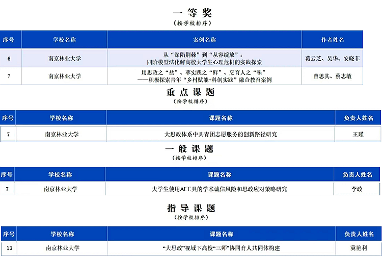 【南林新闻中心讯】近日,2025年江苏省辅导员工作研究委员会辅导员工作案例评选及专项课题立项结果相继揭晓,我校辅导员队伍凭借扎实的工作实践、创新的育人思路和深厚的学术素养,在评选与立项中表现突出,荣获工作案例一等奖2项,专项课题立项3项,充分彰显了我校学生工作的专业水平与育人成效。其中,专项课题获“重点课题”立项1项,限项报送的2篇工作案例全部荣获“一等奖”,一等奖数量位居全省高校前列。
