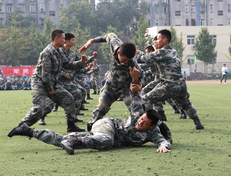 军训汇演在激昂的国歌声中拉开帷幕。随着一声令下,表演方队的同学们喊着整齐、嘹亮的口号进入场地,分别表演了方阵队列、军体拳、战术表演、擒敌拳等内容。经过15天的刻苦训练,表演方队的同学们以饱满的精神,整齐划一的动作赢得了在场师生的阵阵掌声。随后,军训教官进行了倒功表演和擒敌战术表演。