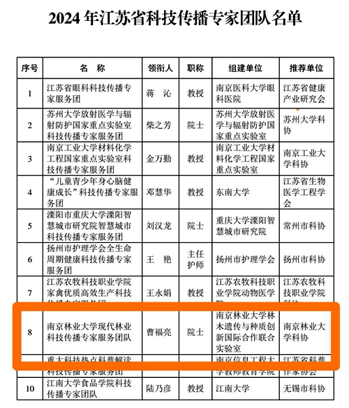 【南林新闻中心讯】近日,江苏省科学技术协会发布《关于公布2024年江苏省科技传播专家的通知》,经自主申报、各单位审核推荐、专家评审、社会公示等程序,我校由曹福亮院士领衔的“南京林业大学现代林业科技传播专家服务团队”成功入选2024年江苏省科技传播专家团队。