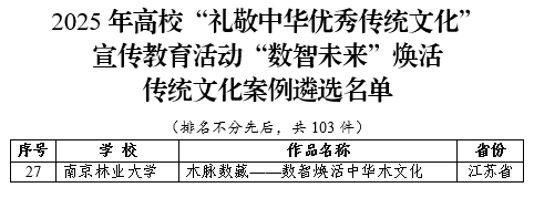 【南林新闻中心讯】近日,教育部公布了2025年高校“礼敬中华优秀传统文化”宣传教育活动评选结果,我校党委宣传部组织报送的2件作品《木脉数藏——数智焕活中华木文化》《烽火岁月筑“绿色长城”——南京林业大学红色文化育人工程创新实践》分别入选“数智未来”焕活传统文化案例和“烽火记忆”高校红色故事。这是继我校2024年2件作品首次入选该项目后,连续两年入选,两年合计入选数量居全省高校第一,充分展现了我校文化育人工作的深厚底蕴和扎实成效。