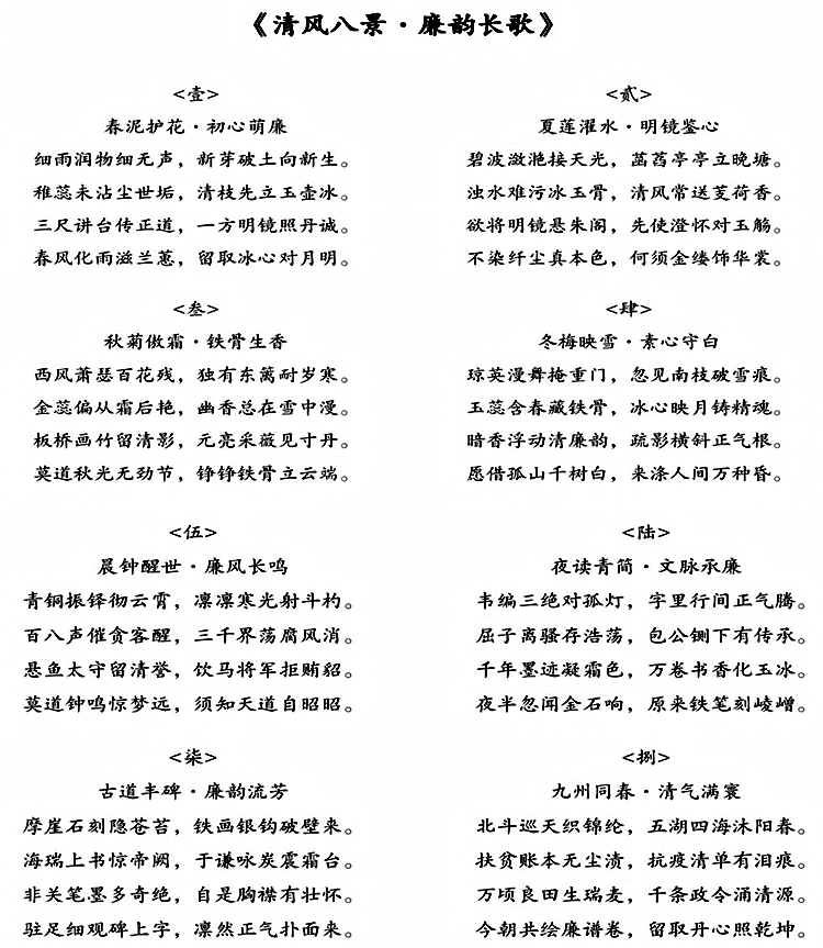作品简介:以“廉”为主线,以四季景致、人文意象为载体,分为《春泥护花·初心萌廉》《夏莲濯水·明镜鉴心》等八章,以古典诗词形式,将春芽、夏莲、秋菊、冬梅的自然之美,与晨钟、夜读、古道、九州的人文底蕴相结合,融入廉洁初心、铁骨正气与家国情怀,既彰显了中华优秀传统文化的魅力,又传递了崇廉尚洁的价值理念,生动诠释了新时代廉洁文化的内涵。
