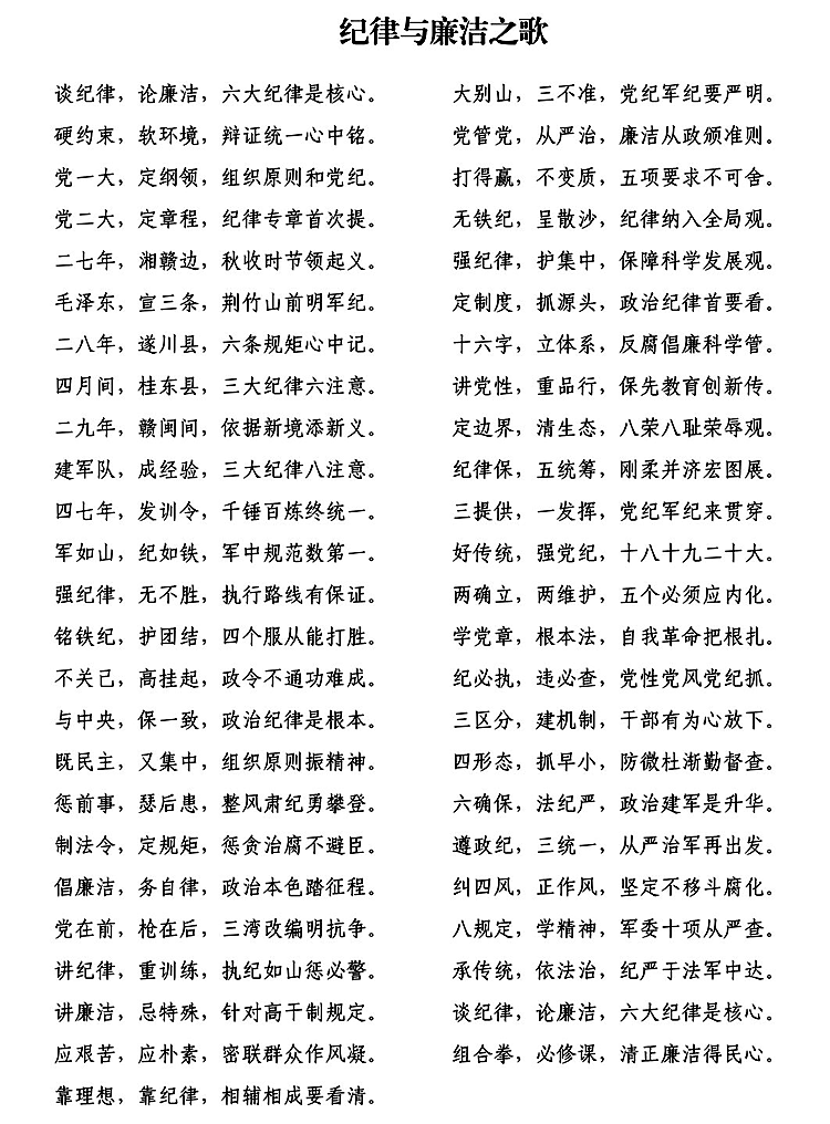 作品简介:以纪律与廉洁为核心,以党史军史纪律建设历程为脉络,采用朗朗上口的歌谣体,开篇点题,首尾呼应。按时间线梳理一大立纲、三大纪律八项注意形成、新时代全面从严治党等关键节点,突出六大纪律、四个服从、纠治四风等核心要求。兼顾历史传承与时代要求,融纪律刚性与廉洁自律于一体,语言通俗、节奏明快,兼具教育性与传播性,旨在开展主题学习教育中,让师生党员在传唱中铭记铁纪、坚守廉洁,筑牢思想防线。