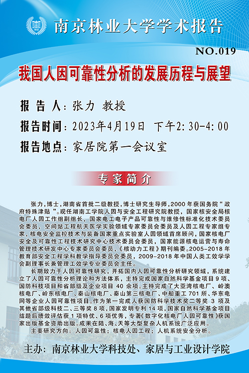 活动预告 首页 -活动预告 我国人因可靠性分析的发展历程与展望 来源:通讯员:摄影:【时间】2023年4月19日(星期二)下午2:30-4:00 【活动地点】家居院第一会议室 【主讲人】张力 教授编辑:浏览:时间:2023-04-18 字号:【大中小】