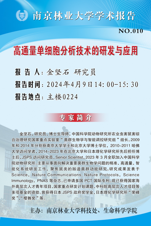 活动预告 首页 -活动预告 高通量单细胞分析技术的研发与应用 来源:通讯员:摄影:【报告人】金坚石 研究员 【报告时间】2024年4月9日 14:00-15:30 【报告地点】主楼0224编辑:浏览:时间:2024-03-22 字号:【大中小】