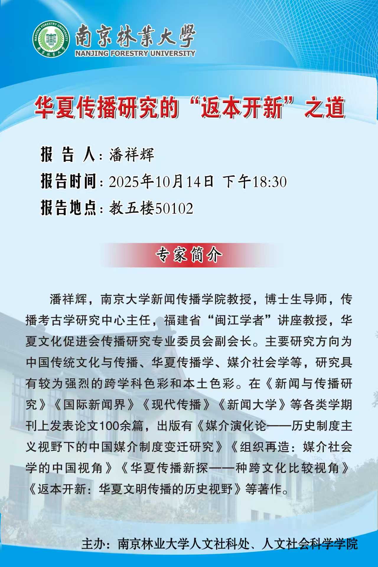 活动预告 首页 -活动预告 华夏传播研究的“返本开新”之道 来源:通讯员:摄影:【报告人】潘祥辉 【报告时间】2025年10月14日下午18:30 【报告地点】教五楼50102编辑:浏览:时间:2025-10-11 字号:【大中小】