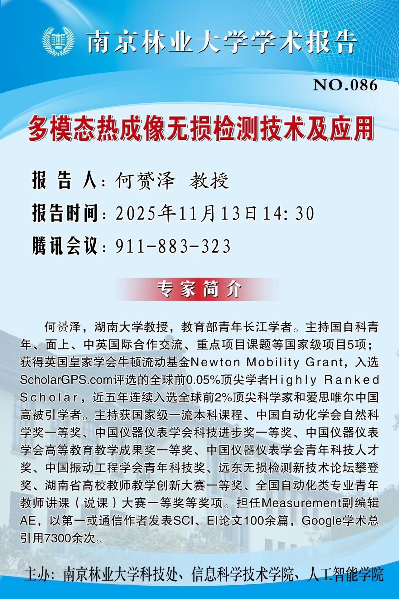 活动预告 首页 -活动预告 多模态热成像无损检测技术及应用 来源:通讯员:摄影:【报告人】何赟泽 教授 【报告时间】2025年11月13日 14:30 【报告地点】911-883-232编辑:浏览:时间:2025-11-03 字号:【大中小】
