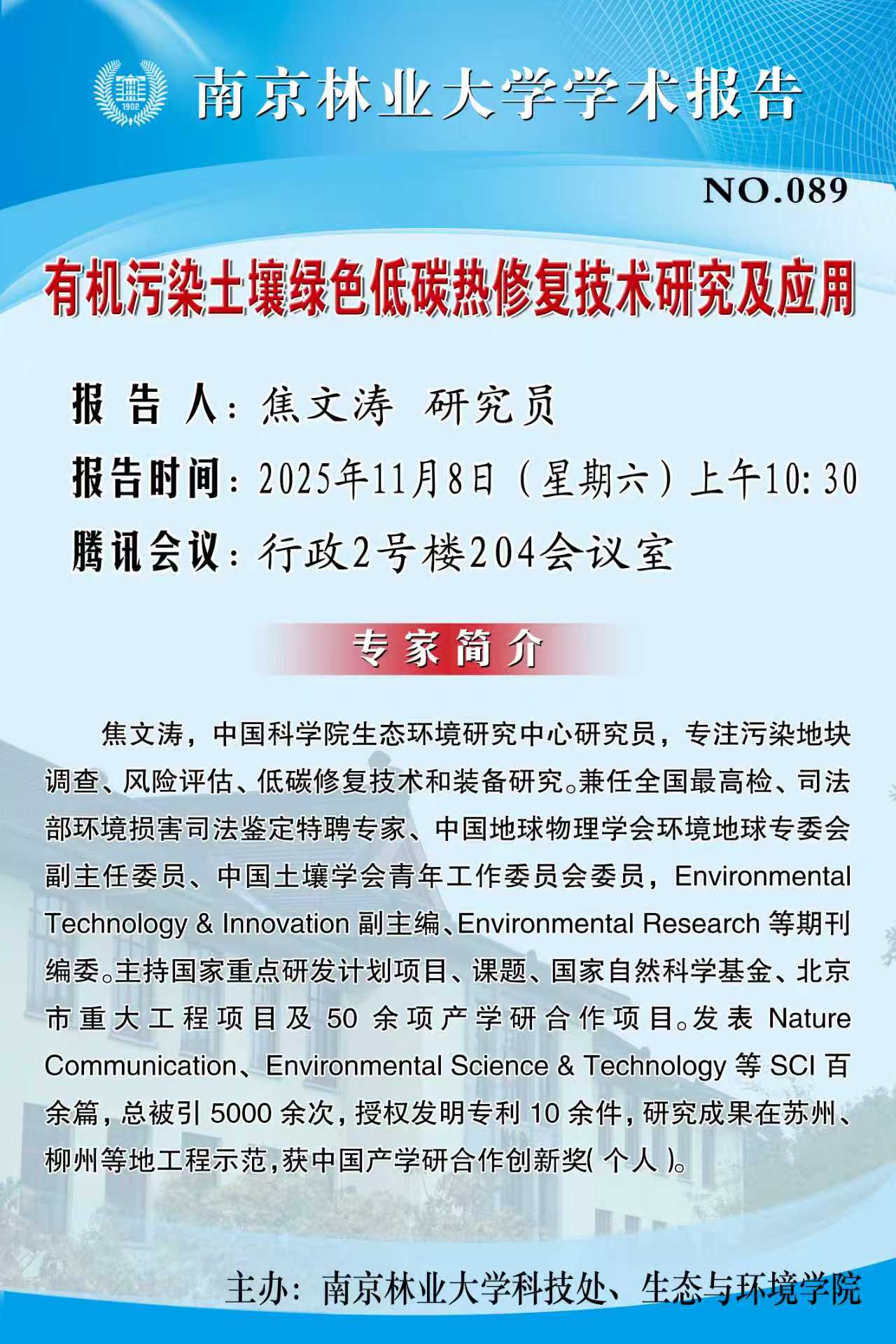 活动预告 首页 -活动预告 有机污染土壤绿色低碳热修复技术研究及应用 来源:通讯员:摄影:【报告人】焦文涛 研究员 【报告时间】2025年11月8日(星期六) 上午10:30 【报告地点】行政2号楼204会议室编辑:浏览:时间:2025-11-07 字号:【大中小】