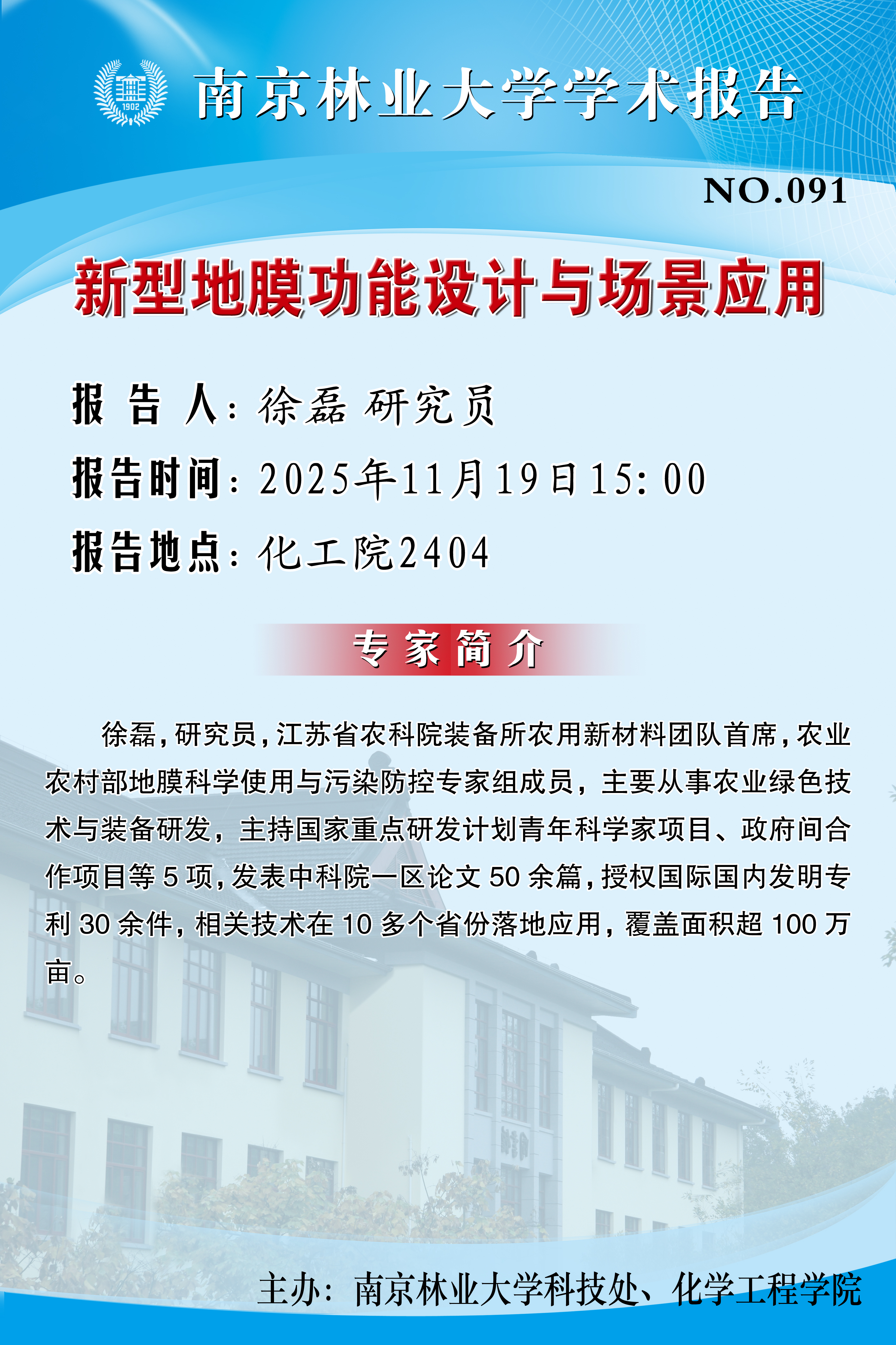 活动预告 首页 -活动预告 新型地膜功能设计与场景应用 来源:通讯员:摄影:【报告人】徐磊 研究员 【报告时间】2025年11月29日15:00 【报告地点】化工院2404编辑:浏览:时间:2025-11-15 字号:【大中小】