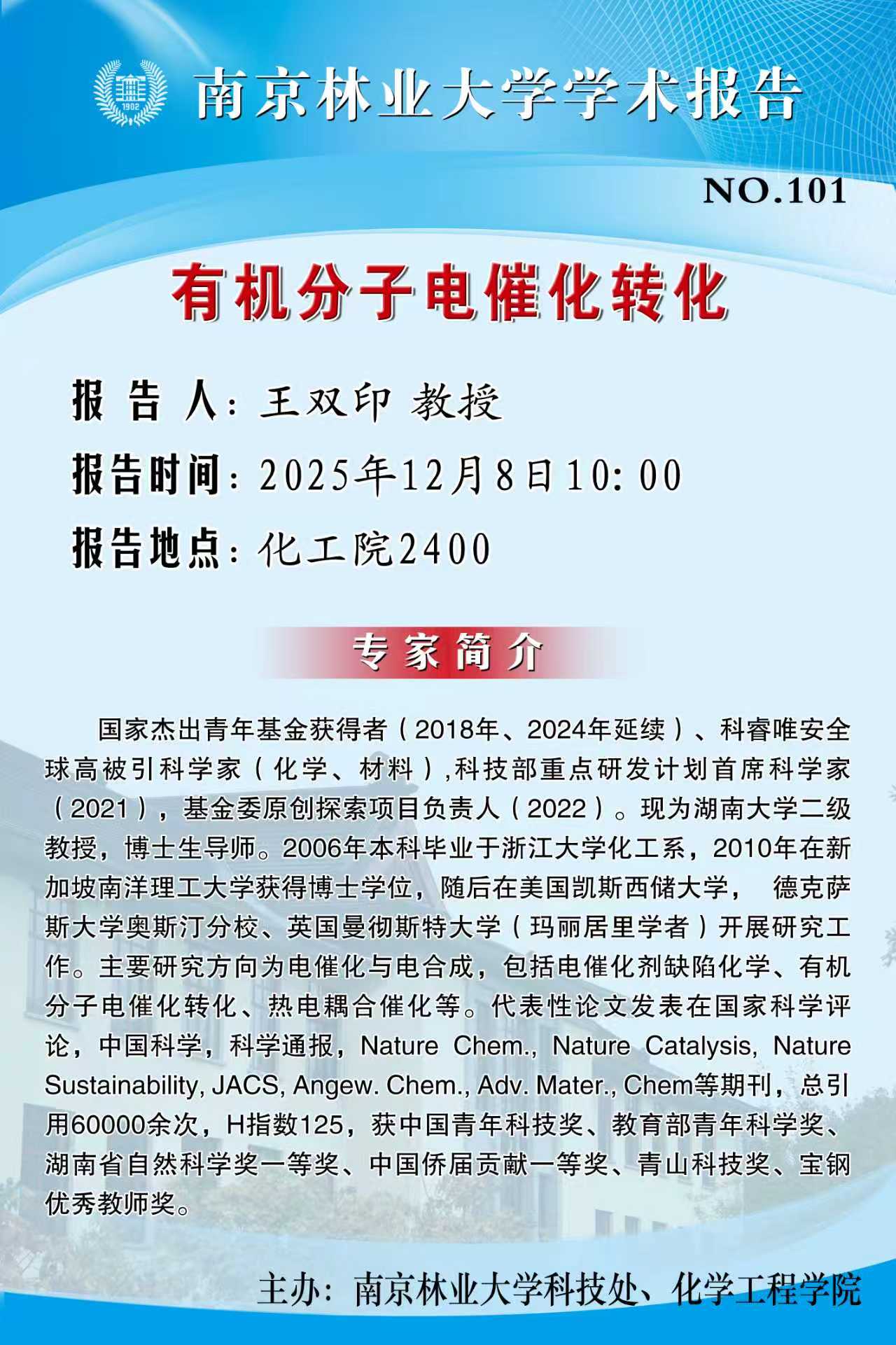 活动预告 首页 -活动预告 有机分子电催化转化 来源:通讯员:摄影:【报告人】王双印 教授 【报告时间】2025年12月8日10:00 【报告地点】化工院2400编辑:浏览:时间:2025-12-03 字号:【大中小】