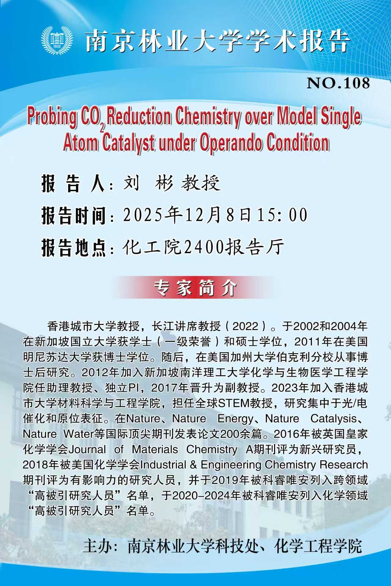 活动预告 首页 -活动预告 Probing CO₂ Reduction Chemistry over Model Single Atom Catalyst under Operando Condition 来源:通讯员:摄影:【报告人】刘 彬 教授 【报告时间】2025年12月8日 15:00 【报告地点】化工院2400报告厅编辑:浏览:时间:2025-12-03 字号:【大中小】