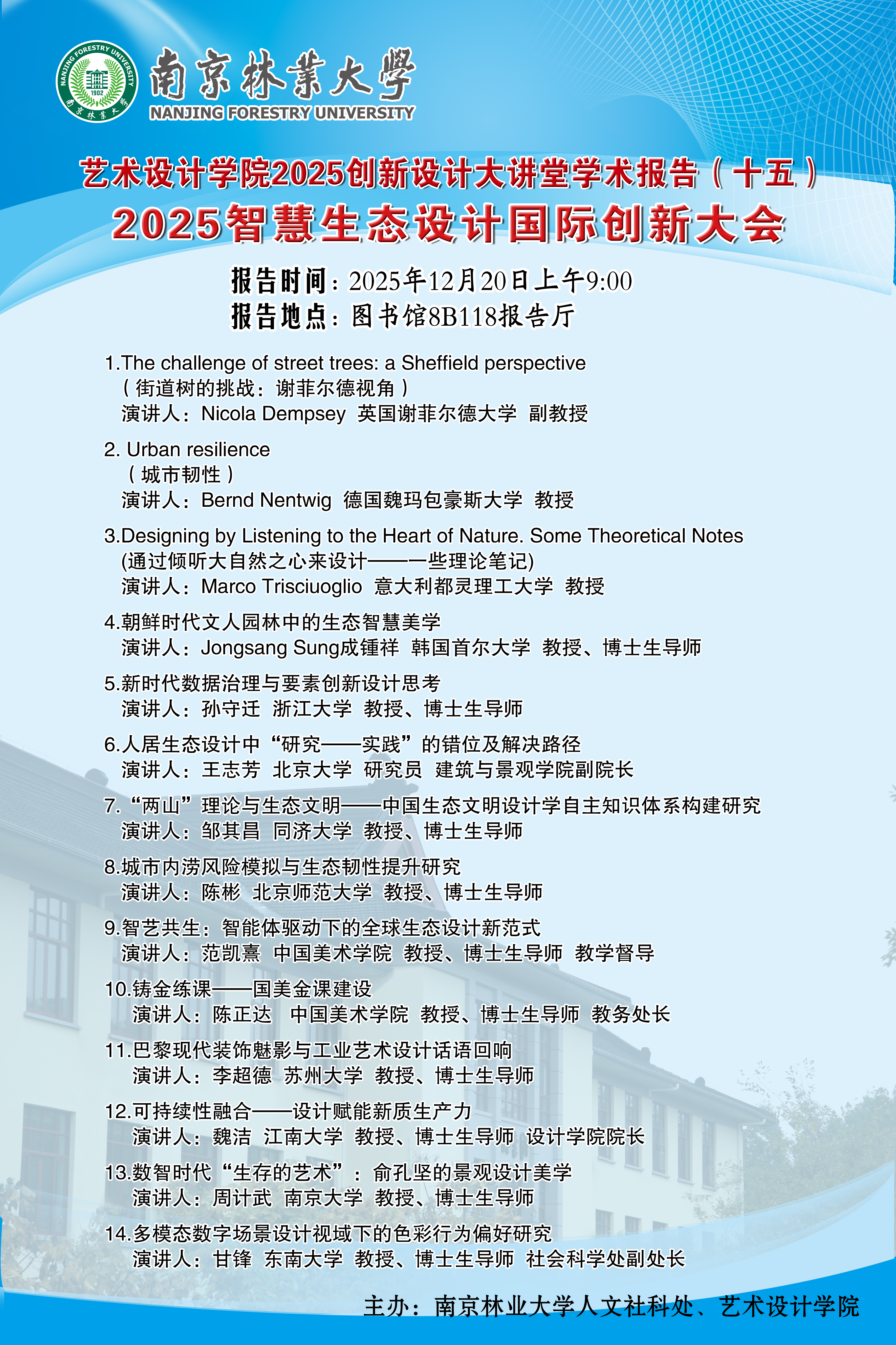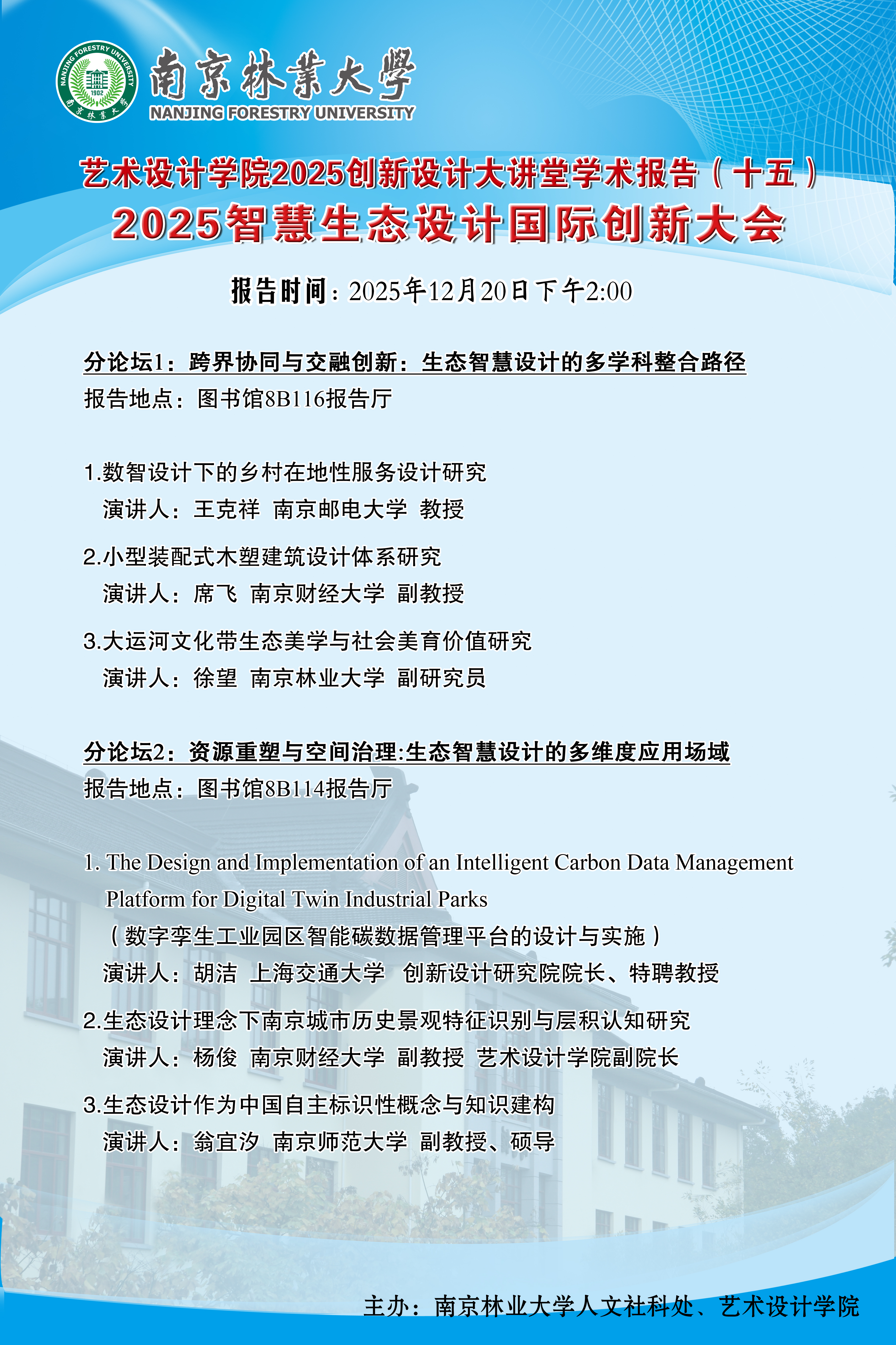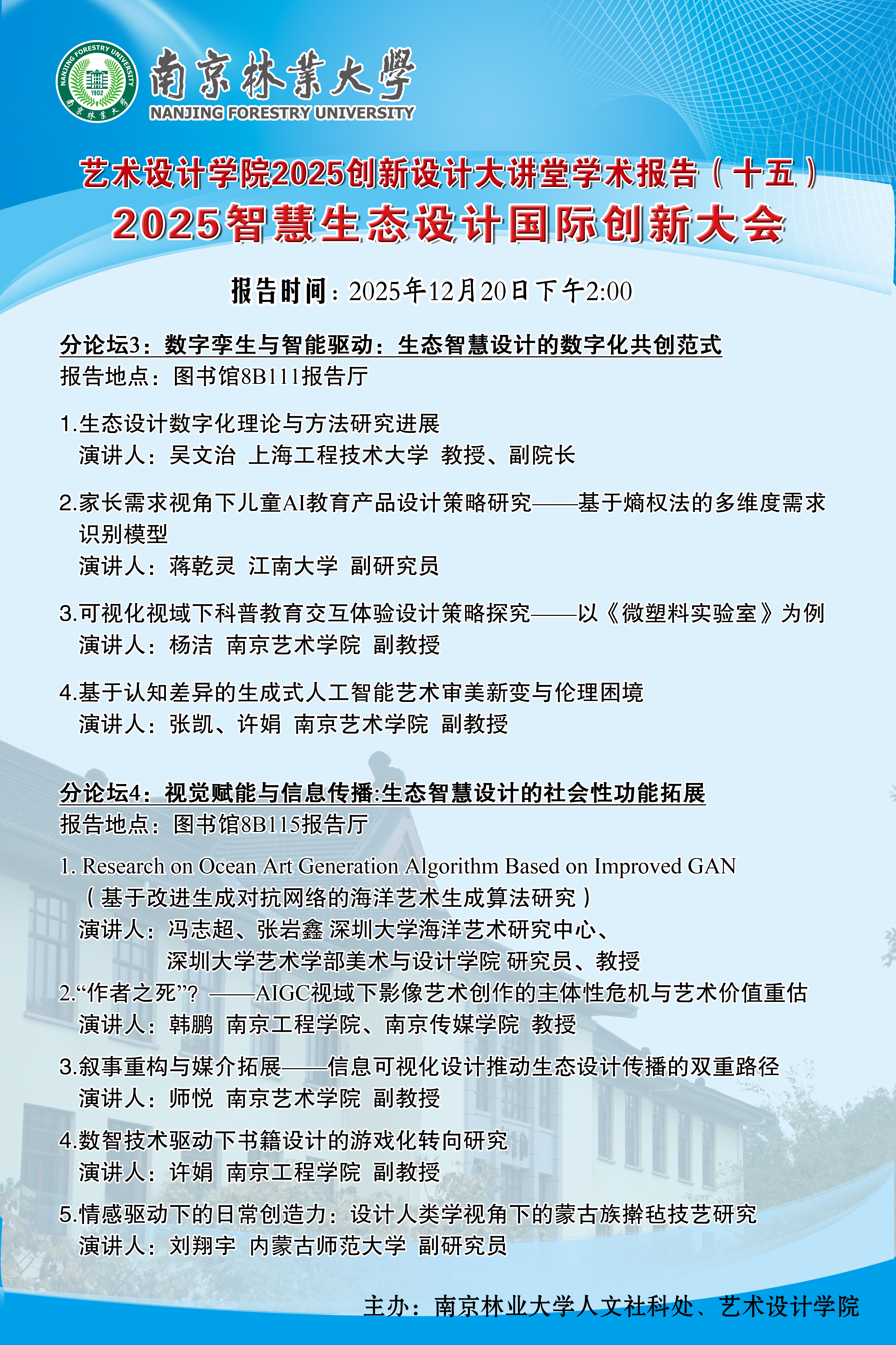 活动预告 首页 -活动预告 2025智慧生态设计国际创新大会 来源:通讯员:摄影:【报告时间】2025年12月20日 上午9:00 【报告地点】图书馆8B118报告厅编辑:浏览:时间:2025-12-08 字号:【大中小】