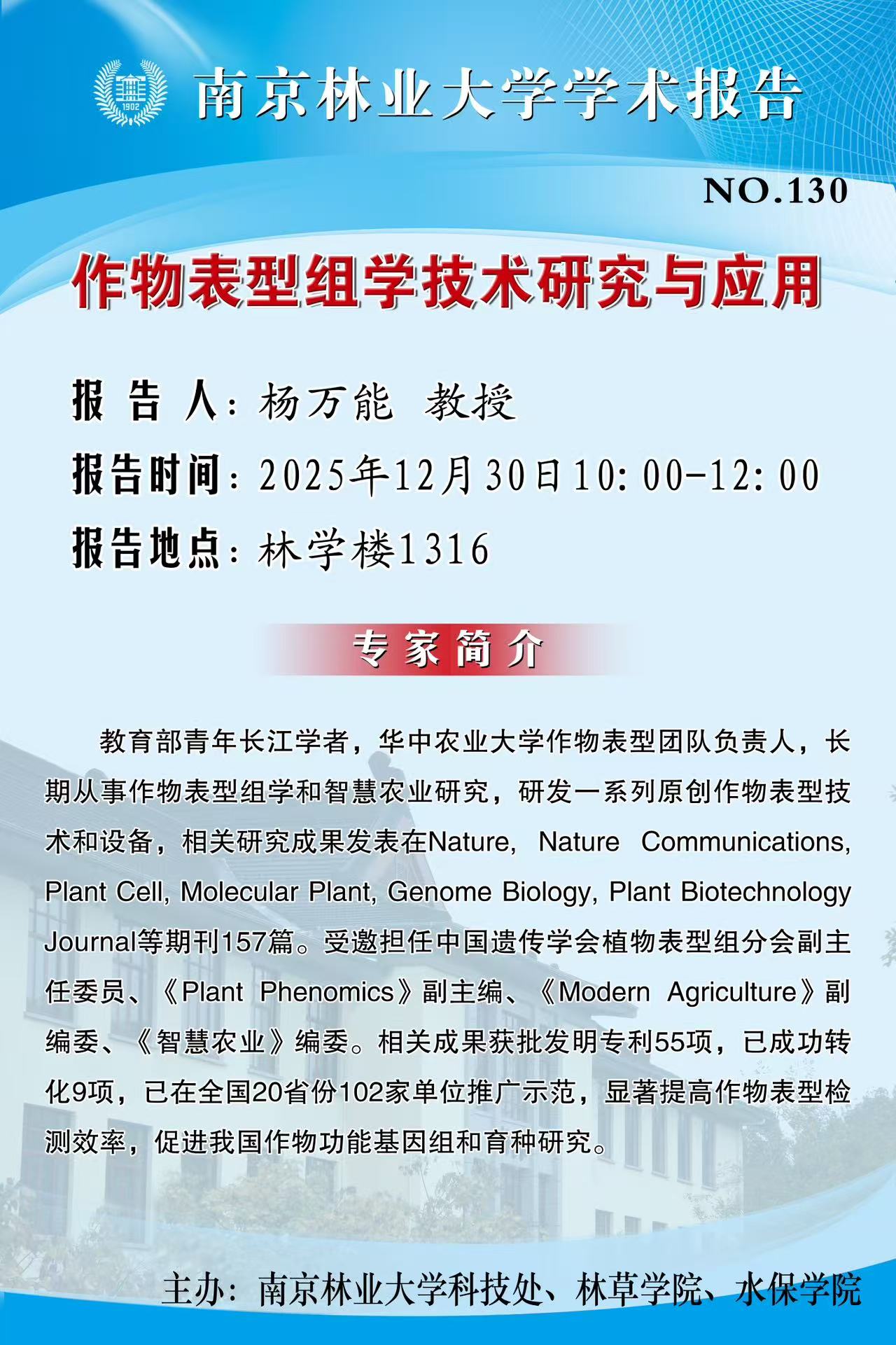 活动预告 首页 -活动预告 作物表型组学技术研究与应用 来源:通讯员:摄影:【报告人】杨万能 教授 【报告时间】2025年12月30日 10:00-12:00 【报告地点】林学楼1316编辑:浏览:时间:2025-12-31 字号:【大中小】
