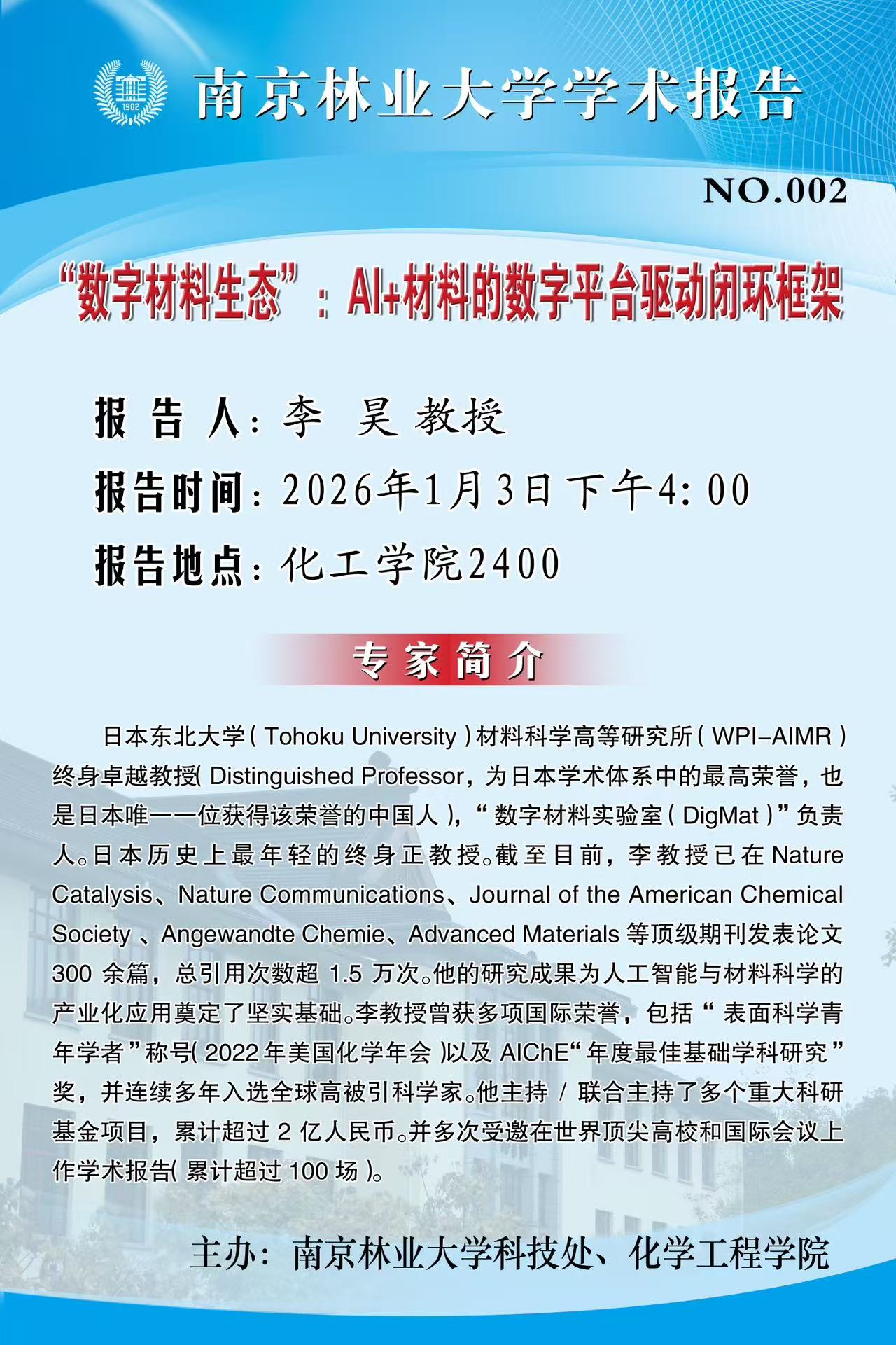 活动预告 首页 -活动预告 "数字材料生态”:AI+材料的数字平台驱动闭环框架 来源:通讯员:摄影:【报告人】李 昊 教授 【报告时间】2026年1月3日 下午4:00 【报告地点】化工院2400编辑:浏览:时间:2025-12-31 字号:【大中小】