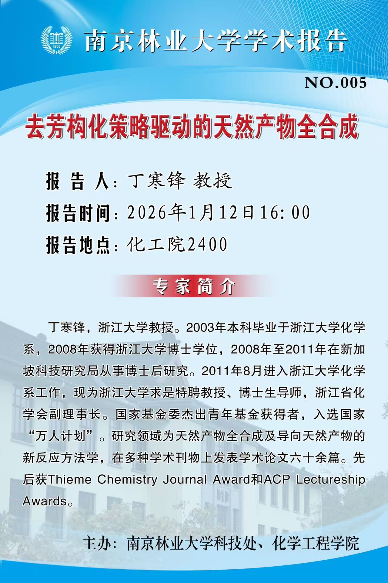活动预告 首页 -活动预告 去芳构化策略驱动的天然产物全合成 来源:通讯员:摄影:【报告人】丁寒锋 教授 【报告时间】2026年1月12日16:00 【报告地点】化工学院2400编辑:浏览:时间:2026-01-08 字号:【大中小】