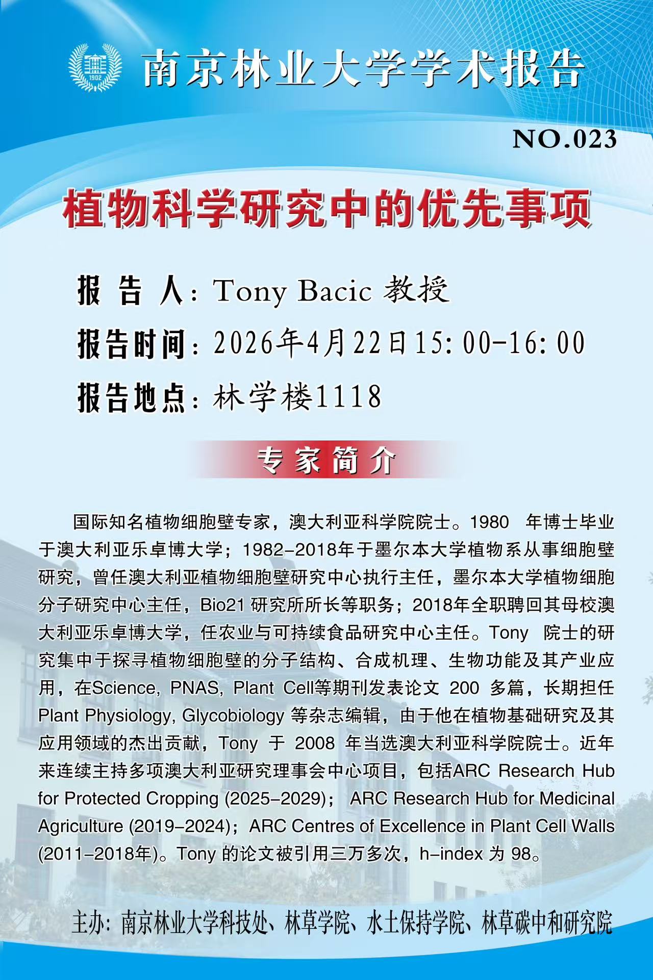 活动预告 首页 -活动预告 植物科学研究中的优先事项 来源:通讯员:摄影:【报告人】Tony Bacic 教授 【报告时间】2026年4月22日15:00-16:00 【报告地点】林学楼1118编辑:浏览:时间:2026-04-16 字号:【大中小】