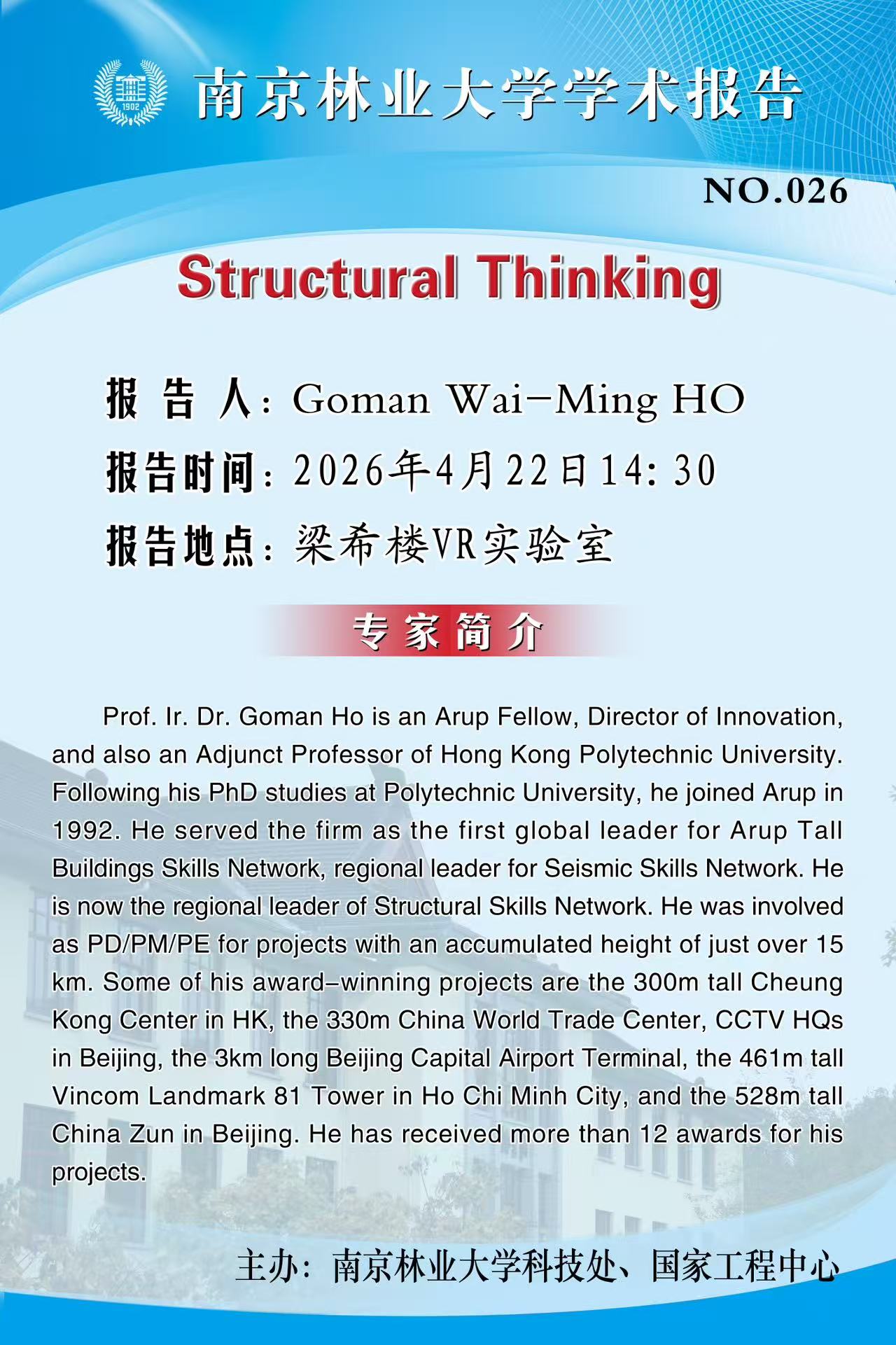 活动预告 首页 -活动预告 Structural Thinking 来源:通讯员:摄影:【报告人】Goman Wai-Ming HO 【报告时间】2026年4月22日14:30 【报告地点】梁希楼VR实验室编辑:浏览:时间:2026-04-21 字号:【大中小】